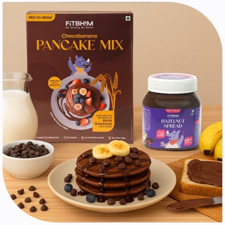 Give breakfast a delicious upgrade with the Pro-To-Grow FitBhim Combo—Chocobanana Pancake Mix (250 g) + Hazelnut Spread (300 g). Inspired by Assam’s indigenous Bhim Banana, this duo brings clean, nourishing ingredients to your family’s table. The pancake mix is enriched with millets, no maida, and gluten free, designed for soft, fluffy, chocolaty pancakes kids love and parents trust. The Hazelnut Spread blends hazelnut butter, cocoa, milk solids and the goodness of Bhim Banana powder, naturally sweetened with jaggery & dates—no refined sugar, no preservatives, no palm oil.