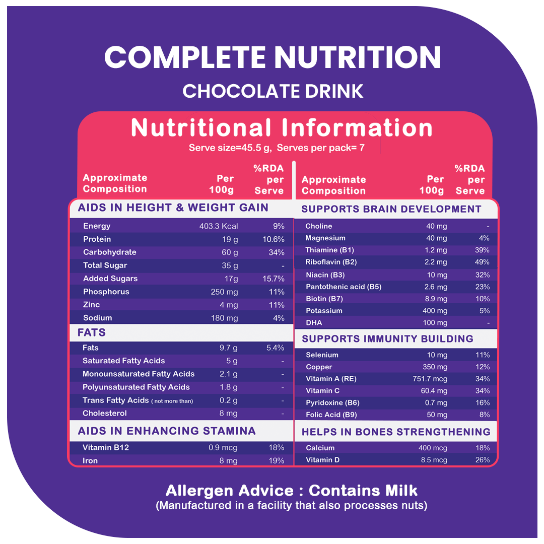 FitBhim contains Bhim Banana, Brahmi, Ashwagandha, Turmeric, essential vitamins, minerals, and high-quality protein to support growth, immunity, and energy in growing kids.