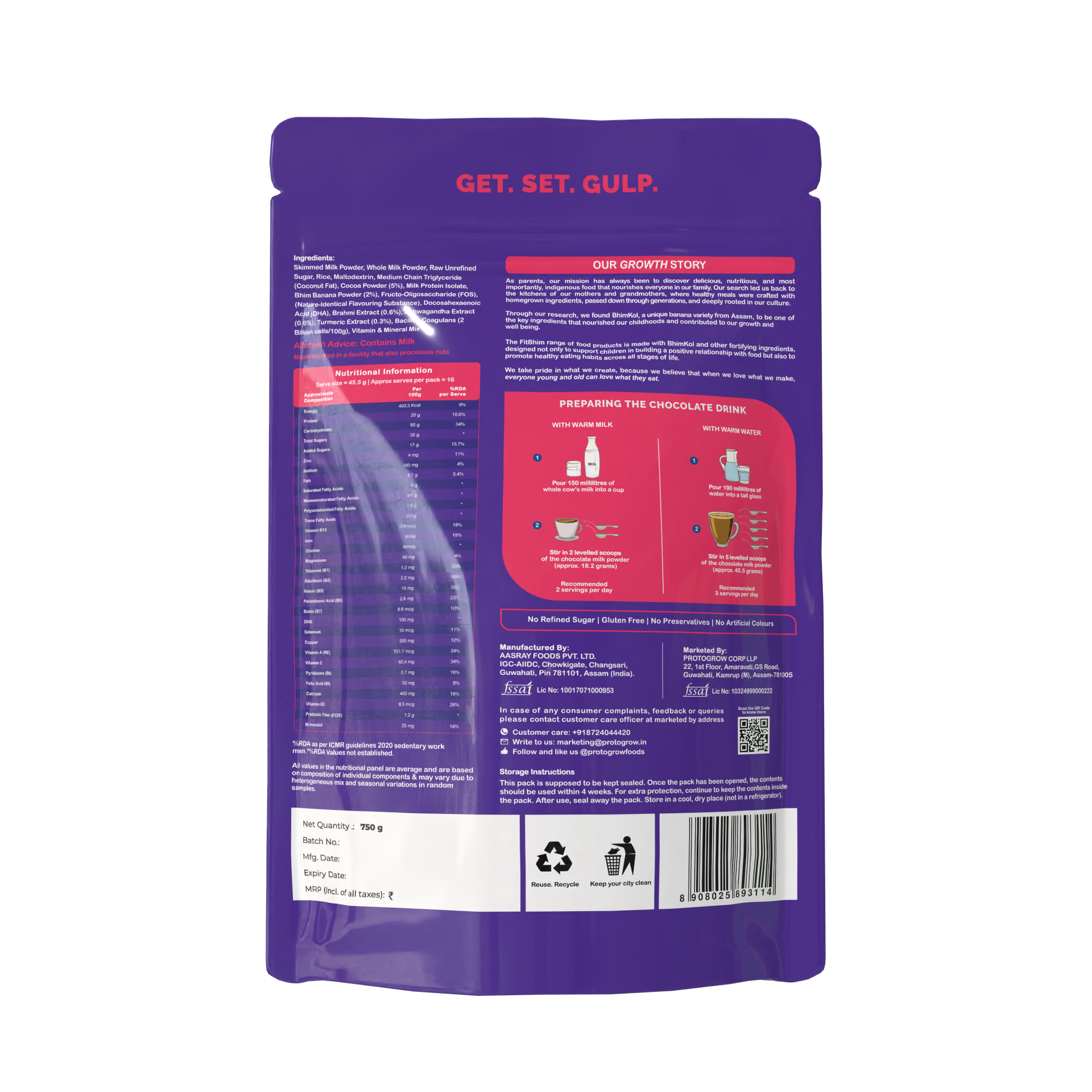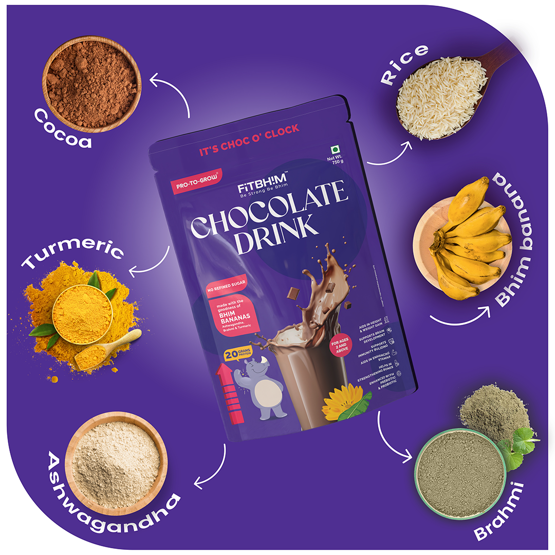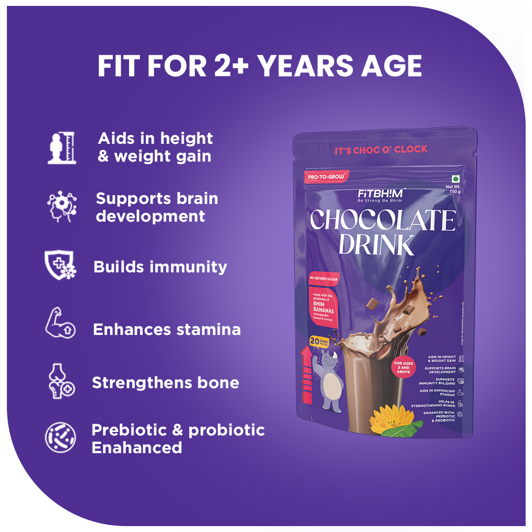 Pro To Grow Fitbhim Chocolate Drink (750g Jar) is a wholesome chocolate-based nutritional beverage crafted to support healthy growth, strength, and daily energy. Made with a Nourishing wellness of milk, ayurvedic wellness, DHA, probiotics and Bhim Bananas fom Assam.