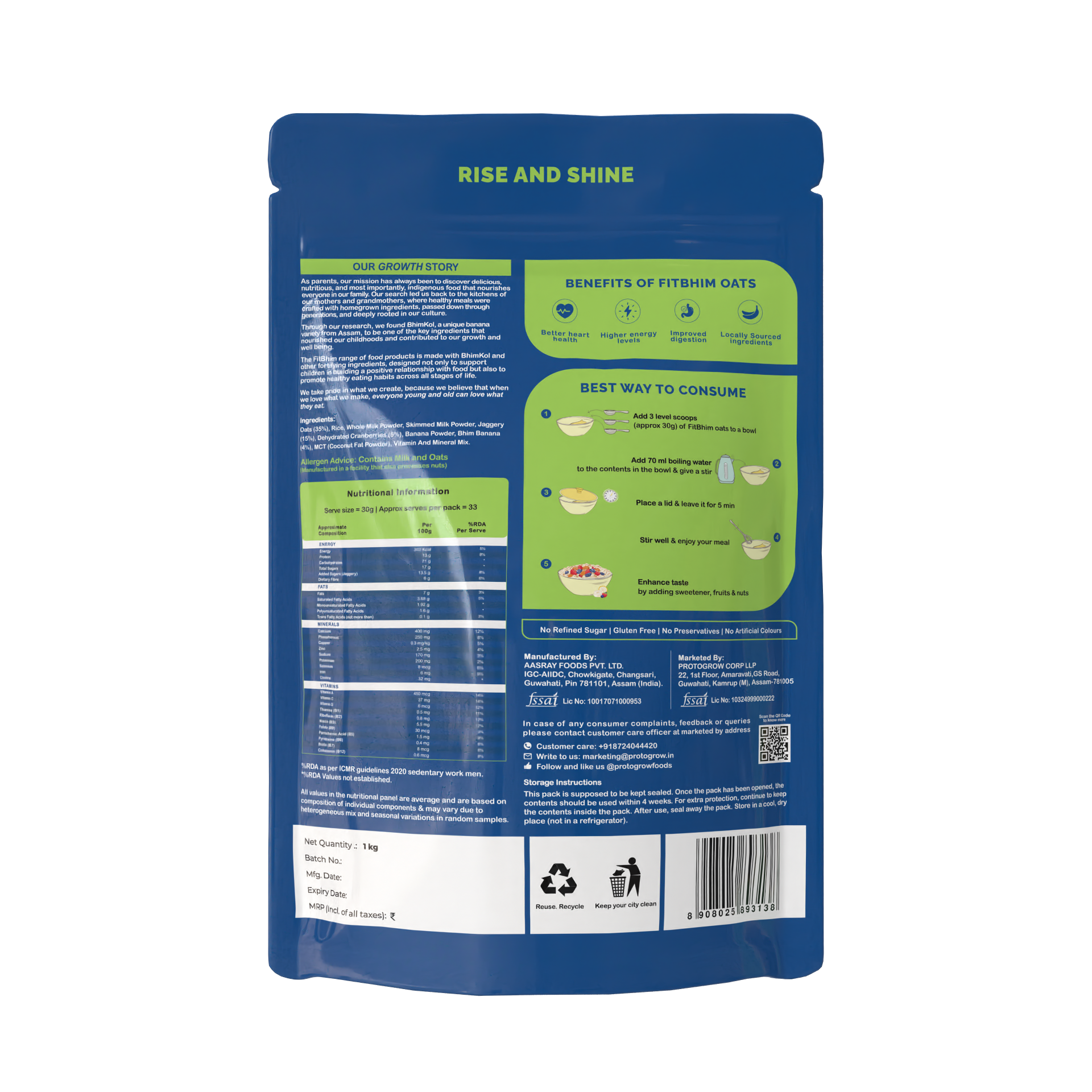 Pack Size: 1KG Free Gift: 500ml FitBhim Bowl + Lid + Spoon Shelf Life: 9 months Allergen Info: Contains Milk & Oats Storage: Store in a cool, dry place